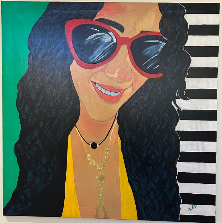 En esta obra, la autora se retrata desde la afirmación de su multiplicidad. El lienzo se convierte en un escenario dividido: de un lado, el verde vibrante evoca la energía vital y la posibilidad de crecimiento; del otro, las franjas en blanco y negro remiten al orden y la claridad. Este contraste dialoga con la figura central, cuya sonrisa franca y mirada oculta detrás de gafas rojas invitan a reflexionar sobre la tensión entre lo que mostramos y lo que reservamos.