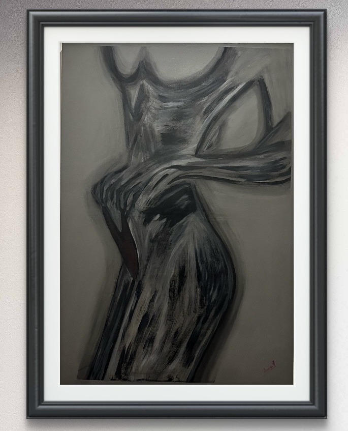 Aquí, la feminidad no necesita rostro para ser reconocida. Es la expresión del cuerpo, elegante y fuerte a la vez, lo que comunica una historia. El gris dominante crea un ambiente de introspección, mientras que los contrastes de negro y blanco añaden dramatismo, como si la figura estuviera a punto de romper el silencio con movimiento o palabra.