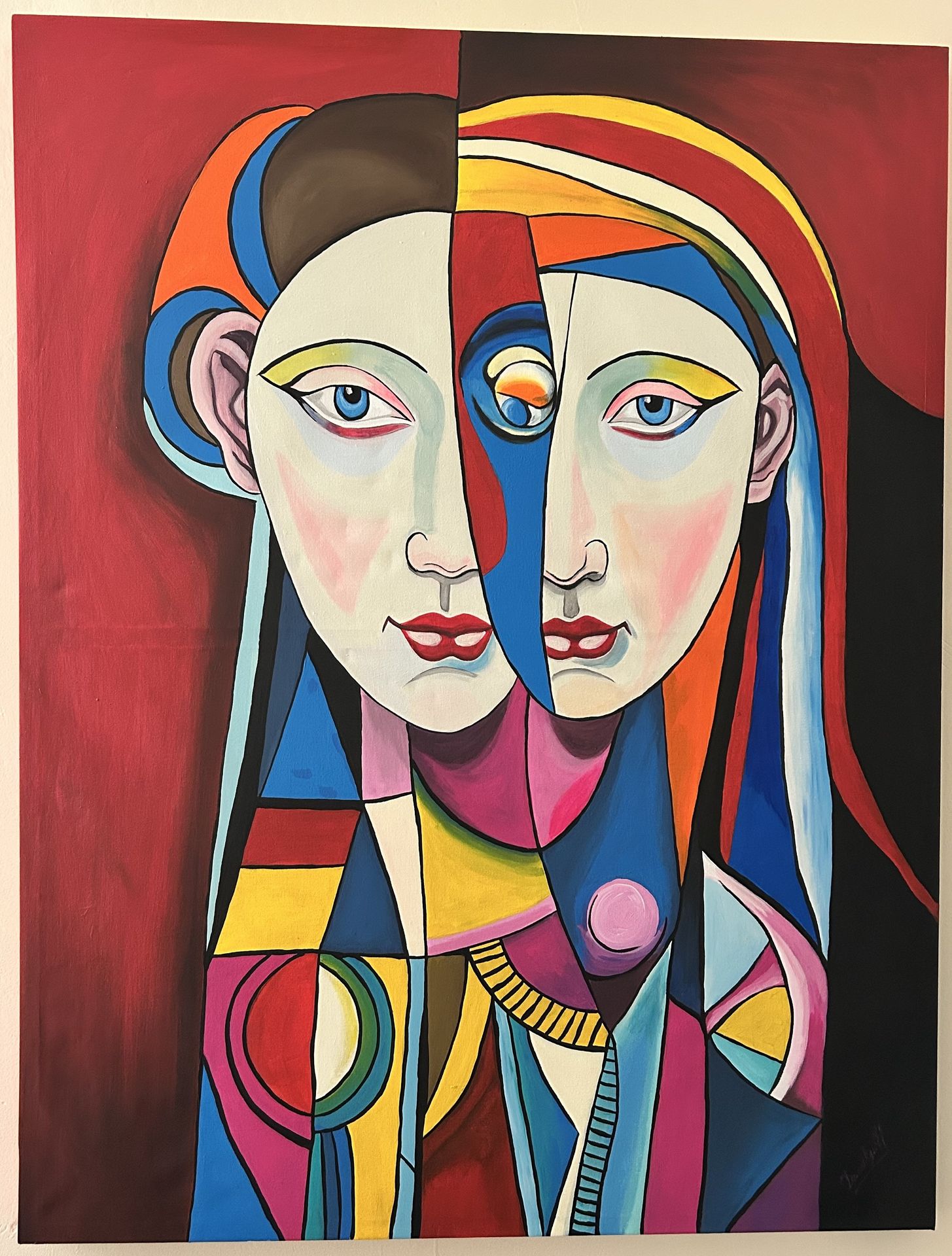 Los colores vibrantes, contrastados entre cálidos y fríos, refuerzan la tensión entre opuestos: lo interior y lo exterior, lo que se muestra y lo que se oculta, lo íntimo y lo social. El tercer ojo, incrustado en la fisura, no solo es símbolo de visión interior, sino también un recordatorio de que la percepción nunca es una, sino plural.