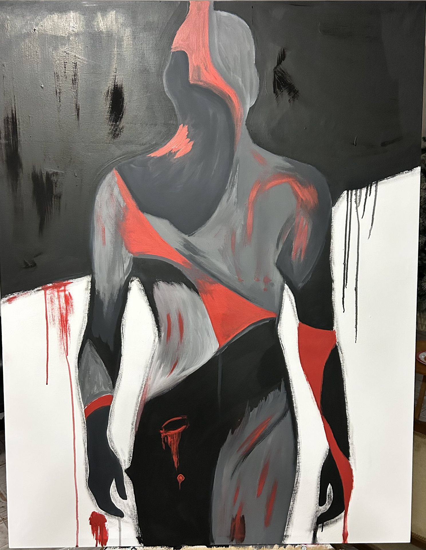 En esta obra, el cuerpo masculino emerge como territorio de batalla: un guerrero que, aunque erguido, exhibe sus cicatrices como parte inseparable de su identidad. La silueta, marcada en grises y negros, refleja la dureza de la coraza que la cultura ha impuesto sobre el hombre: firmeza, silencio, control. Sin embargo, las rupturas en rojo desgarran esa superficie, recordando que incluso en el cuerpo más fuerte habita la vulnerabilidad.