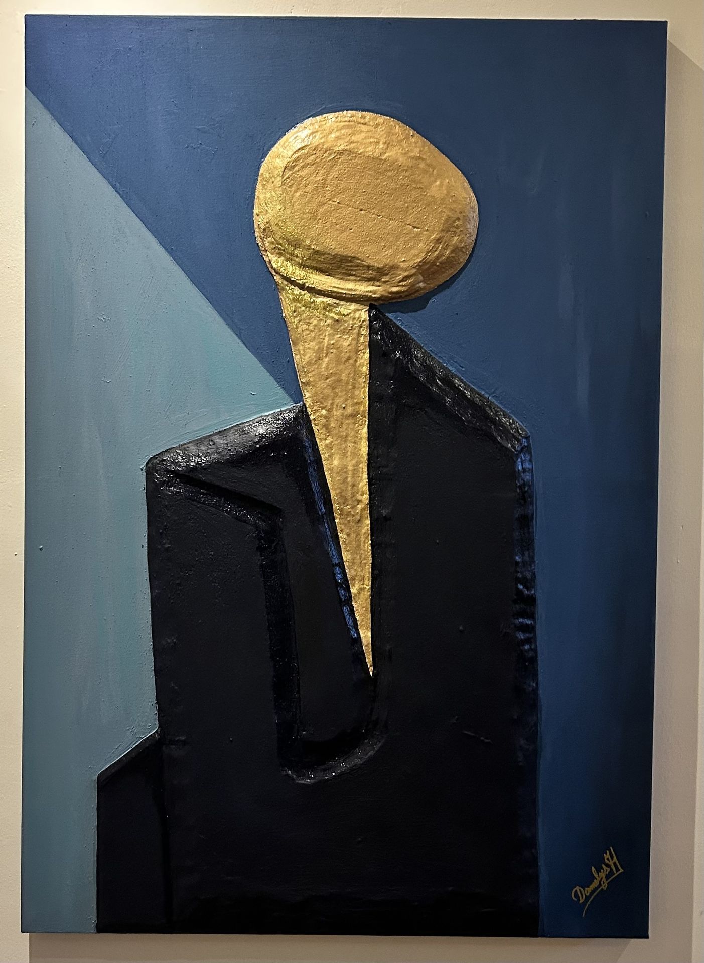 La paleta sobria de azules y negros contrasta con la fuerza luminosa del oro, generando un juego de poder entre lo terrenal y lo sagrado.